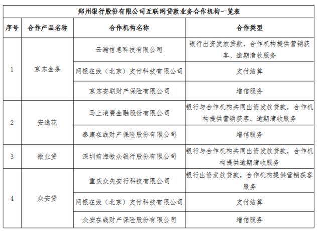 10月底,郑州银行公示了4家互联网贷款业务合作机构,合作产品名称分别为京东金条、安逸花、微业贷、众安贷。