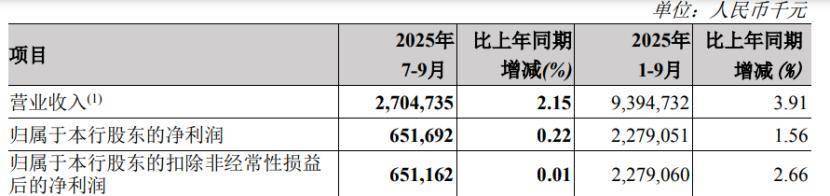 数据显示,2025年前三季度,该行的营业总收入为93.95亿元,同比增长3.91%,归母净利润为22.79亿元,同比增长1.56%。单拎第三季度的数据来看,该行营收增幅仅为2.15%,归母净利增幅仅为0.22%。