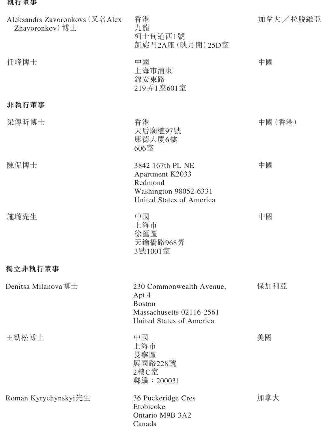英矽智能执行董事分别为Aleksandrs Zavoronkovs(又名Alex Zhavoronkov)博士、任峰博士;非执行董事分别为梁传昕博士、陈侃博士、施珑;独立非执行董事分别为王劲松博士、Denitsa Milanova博士、Roman Kyrychynskyi。