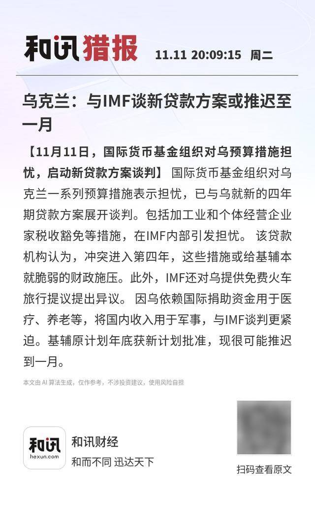 【11月11日,国际货币基金组织对乌预算措施担忧,启动新贷款方案谈判】国际货币基金组织对乌克兰一系列预算措施表示担忧,已与乌就新的四年期贷款方案展开谈判。包括加工业和个体经营企业家税收豁免等措施,在IMF内部引发担忧。 该贷款机构认为,冲突进入第四年,这些措施或给基辅本就脆弱的财政施压。此外,IMF还对乌提供免费火车旅行提议提出异议。 因乌依赖国际捐助资金用于医疗、养老等,将国内收入用于军事,与IMF谈判更紧迫。基辅原计划年底获新计划批准,现很可能推迟到一月。
