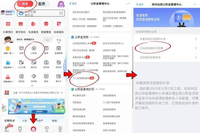 第一步:征信授权。申请人及配偶分别登录“郑好办”APP,打开公积金服务专区,点击“个人征信授权查询”-“征信查询授权书签署”菜单,系统自动调取数据完成征信授权。