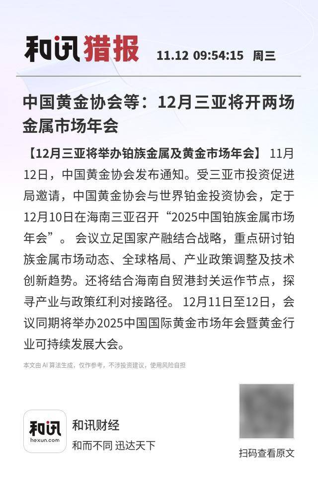【12月三亚将举办铂族金属及黄金市场年会】11月12日,中国黄金协会发布通知。受三亚市投资促进局邀请,中国黄金协会与世界铂金投资协会,定于12月10日在海南三亚召开“2025中国铂族金属市场年会”。会议立足国家产融结合战略,重点研讨铂族金属市场动态、全球格局、产业政策调整及技术创新趋势。还将结合海南自贸港封关运作节点,探寻产业与政策红利对接路径。12月11日至12日,会议同期将举办2025中国国际黄金市场年会暨黄金行业可持续发展大会。