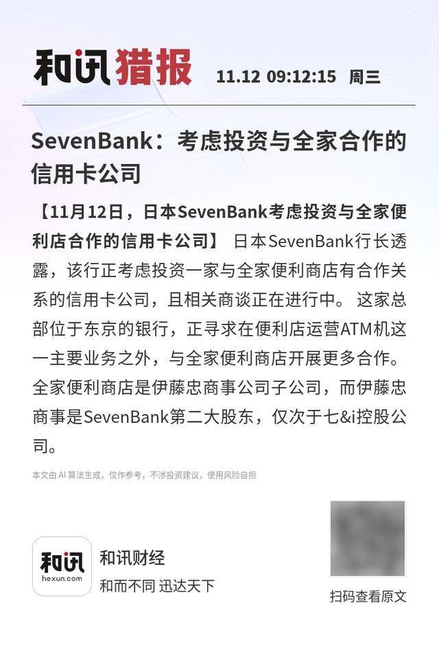 【11月12日,日本SevenBank考虑投资与全家便利店合作的信用卡公司】日本SevenBank行长透露,该行正考虑投资一家与全家便利商店有合作关系的信用卡公司,且相关商谈正在进行中。 这家总部位于东京的银行,正寻求在便利店运营ATM机这一主要业务之外,与全家便利商店开展更多合作。 全家便利商店是伊藤忠商事公司子公司,而伊藤忠商事是SevenBank第二大股东,仅次于七&i控股公司。