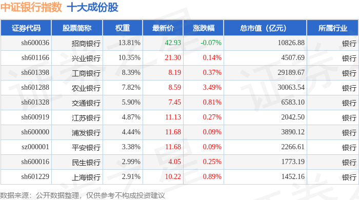 证券之星消息,11月12日,中证银行(399986)指数报收于7854.32点,涨0.48%,成交344.6亿元,换手率0.34%。当日该指数成份股中,上涨的有26家,农业银行以3.49%的涨幅领涨,下跌的有12家,西安银行以0.72%的跌幅领跌。