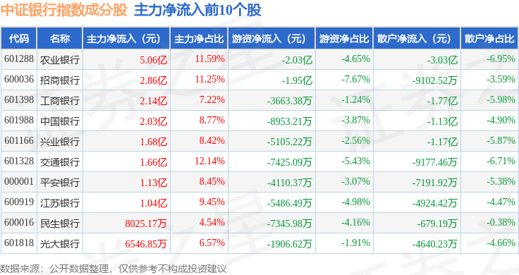 资金流向方面,中证银行(399986)指数成份股当日主力资金净流入合计19.92亿元,游资资金净流出合计6.55亿元,散户资金净流出合计13.37亿元。成份股资金流向详情见下表: