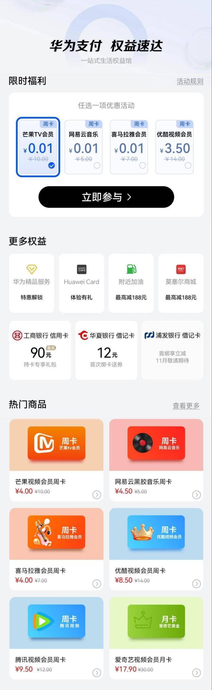 “淘”完好物,付款就是最后的乐趣了。这里我必须强力推荐华为支付,它的“一站式生活权益馆”简直是宝藏。双11期间,我抢到了1分钱的芒果TV周卡,还有网易云音乐会员也是超低价。在华为商城购物用工银信用卡支付,还能享受10-40元优惠券包,领取路径:桌面右滑 > 搜索华为支付,快乐体验一下华为支付吧!
