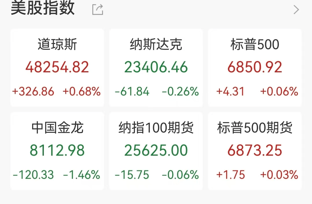 11月12日,美国三大股指收盘涨跌不一,道指涨0.68%报48254.82点,续创收盘新高。标普500指数涨0.06%,纳指跌0.26%。