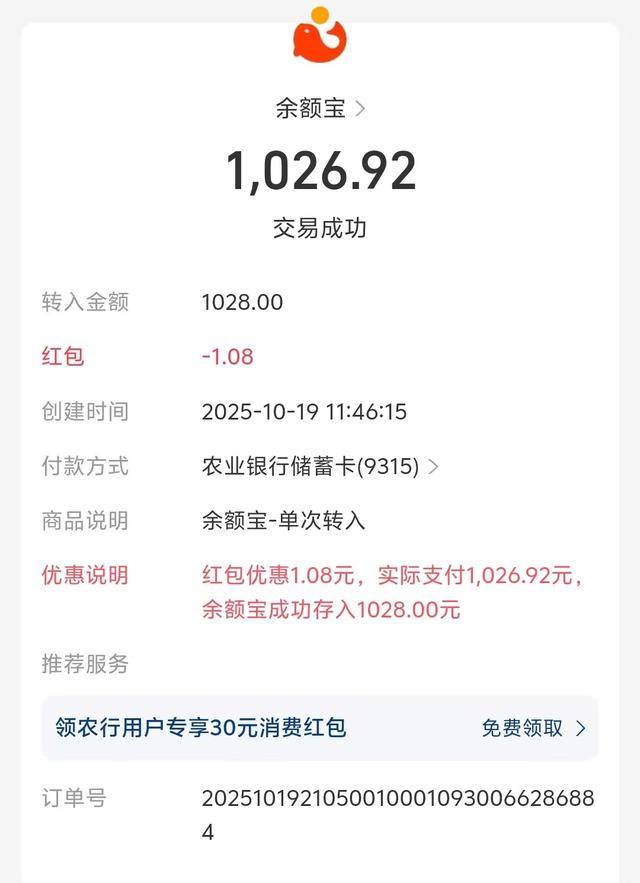 发现异常后,蔡先生立即拨打了农业银行客服电话95599,被告知这笔1026.92元的扣费,是通过支付宝平台完成的交易,具体扣费原因银行方无法查询。“可以在支付宝里面查一下,这个天弘基金可能是支付宝的余额宝。”该客服人员称。