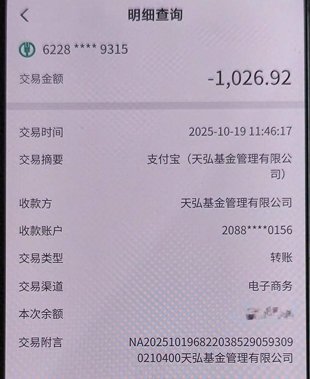蔡先生向顶端新闻记者提供的农业银行交易明细截图显示,其农业银行卡在10月19日11点46分发生了一笔交易,数额为1026.92元,收款方为天弘基金管理有限公司,收款账户为2088****0156,交易类型为转账,交易渠道为电子商务。