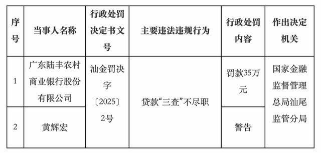 11月13日,国家金融监督管理总局汕尾监管分局披露的行政处罚信息公开表显示,因贷款“三查”不尽职,广东陆丰农村商业银行股份有限公司被罚35万元。