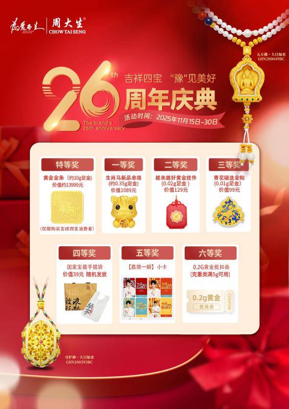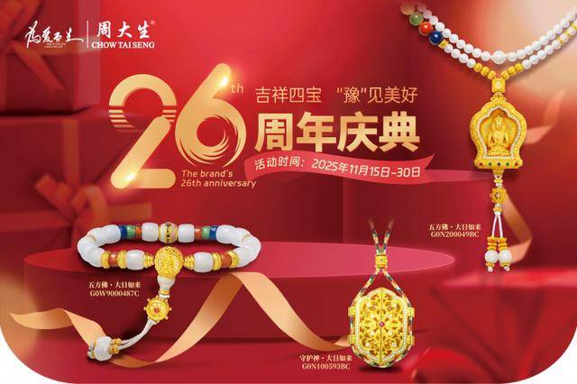 自1999年首店开业,周大生已深耕26载,凭借卓越品质与创新设计,赢得了众多消费者的深厚信赖。周大生始终秉承“为爱而生”的理念,截至2025年11月在河南省已开设400多家门店,成为河南珠宝市场的重要参与者。本次26周年庆典,将延续双十一的狂欢,在活动力度和互动体验上全面升级。
