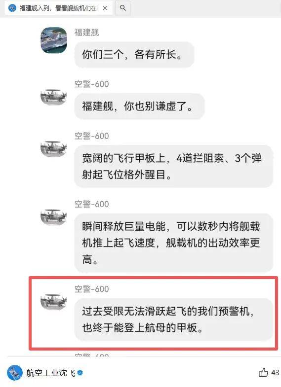 中航工业沈飞集团在11月11日、“福建”号航母入列后几天,在自己的微信公众号上发表了一篇题为《“福建”入列,看看舰载机们在聊什么》的文章。文章中,首次提到了军迷们关注的、空警-600型预警机是否能在“辽宁”舰、“山东”舰这两艘滑跃起飞航空母舰上运作的相关情况。