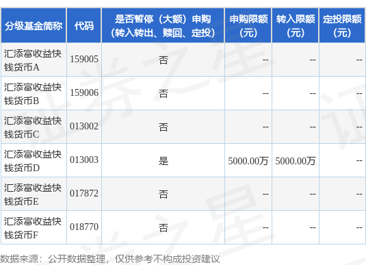 2、自2025年11月18日起(含2025年11月18日),汇添富收益快钱货币D暂停大额申购、大额转换转入、大额定期定额投资业务,单日单个基金账户单笔或多笔累计申购、转换转入、定期定额投资的金额不应超过50000000人民币元(含50000000人民币元 )。当单日某基金账户单笔或多笔累计申购、转换转入、定期定额投资该份额的金额超过50000000人民币元,本公司将部分或全部拒绝。该份额暂停上述大额业务期间,其他业务仍照常办理。本基金汇添富收益快钱货币D恢复大额申购、大额转换转入、大额定期定额投资业务的具体时间将另行公告。