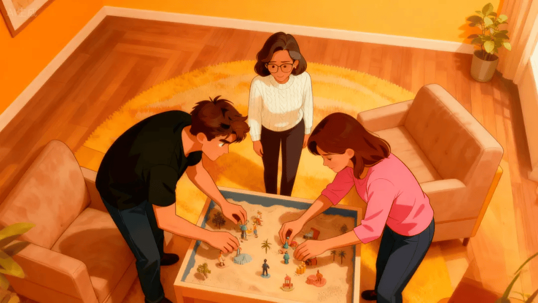 一张沙发,几副桌椅,暖黄色的灯光驱散了司法空间的严肃感——这里便是东港法院“家事心语”咨询室。沙盘台上,细沙松软铺开,小木屋、人物雕像、汽车模型等各式沙具整齐排列,仿佛在静静等待承载家庭里未说出口的心事。