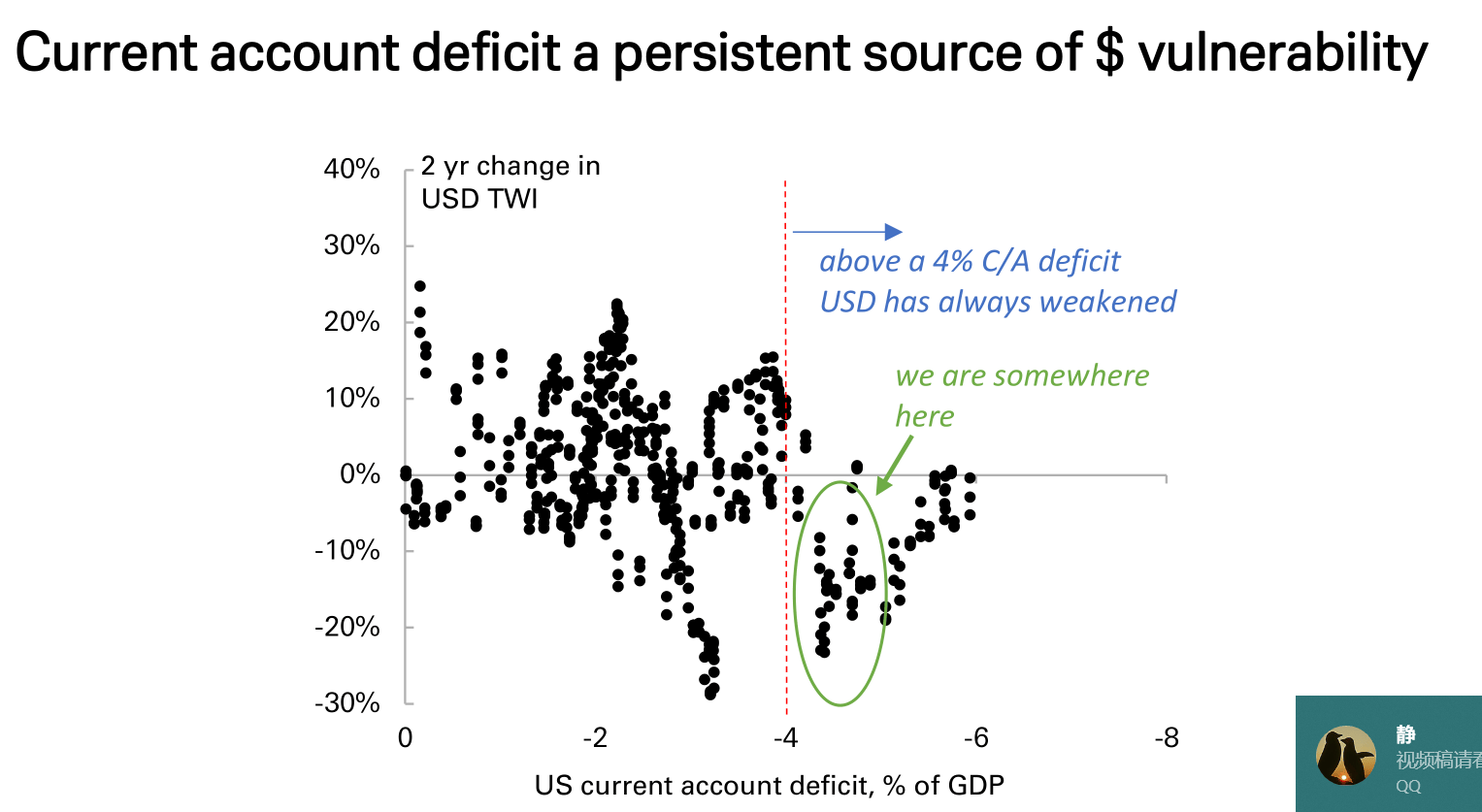 美国的国际收支状况是其长期存在的结构性弱点。报告强调,经常账户赤字是美元持续的脆弱性来源。历史数据揭示了一个严峻的规律:一旦美国经常账户赤字占GDP的比重超过4%,美元无一例外都会走弱。报告图表暗示,目前美国正处于这一危险区域附近。