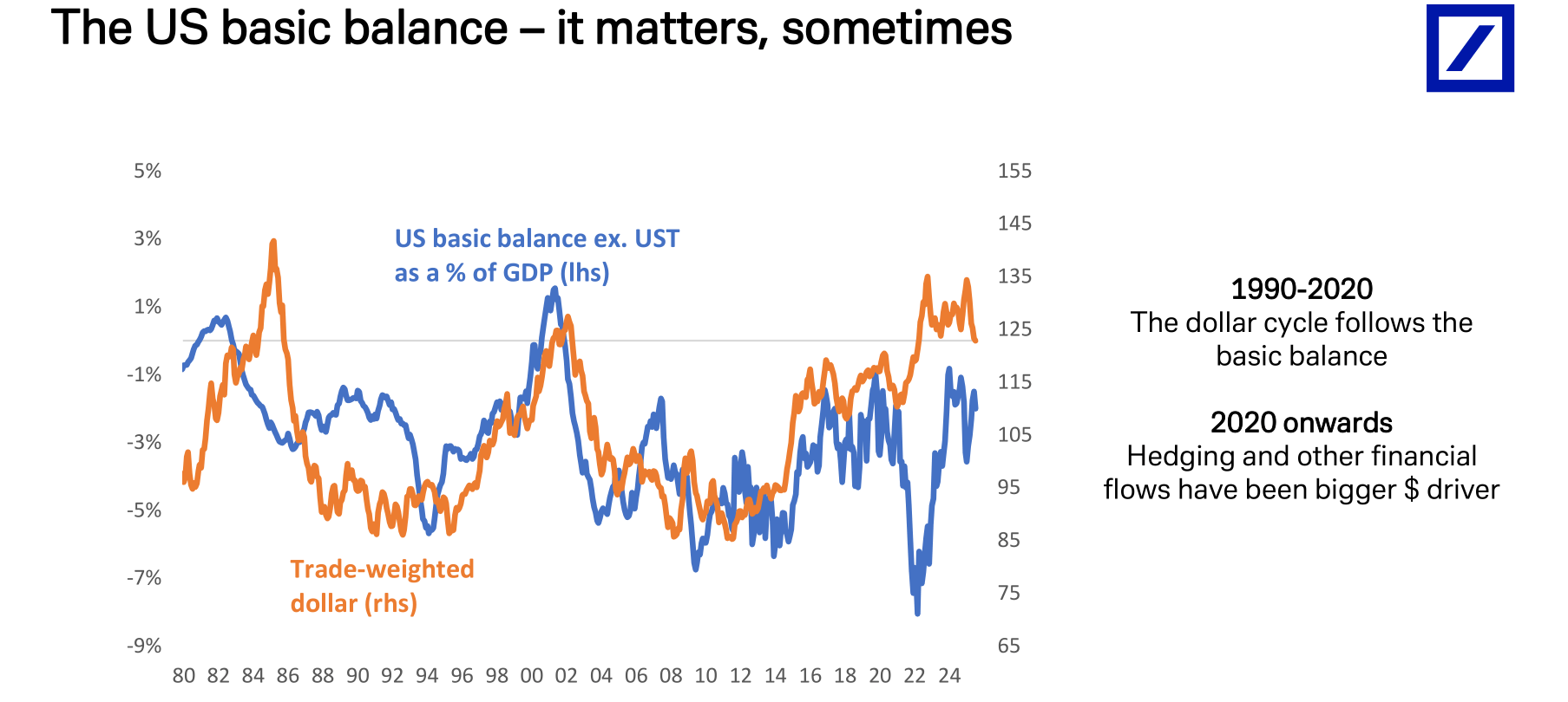 更值得关注的是资本流动的结构性变化。自2020年以来,推动美元走势的主导因素已从传统的国际收支基本面,转向了对冲行为和其他金融流动。数据显示,外国投资者在购买美国资产时的行为模式发生了根本性转变。