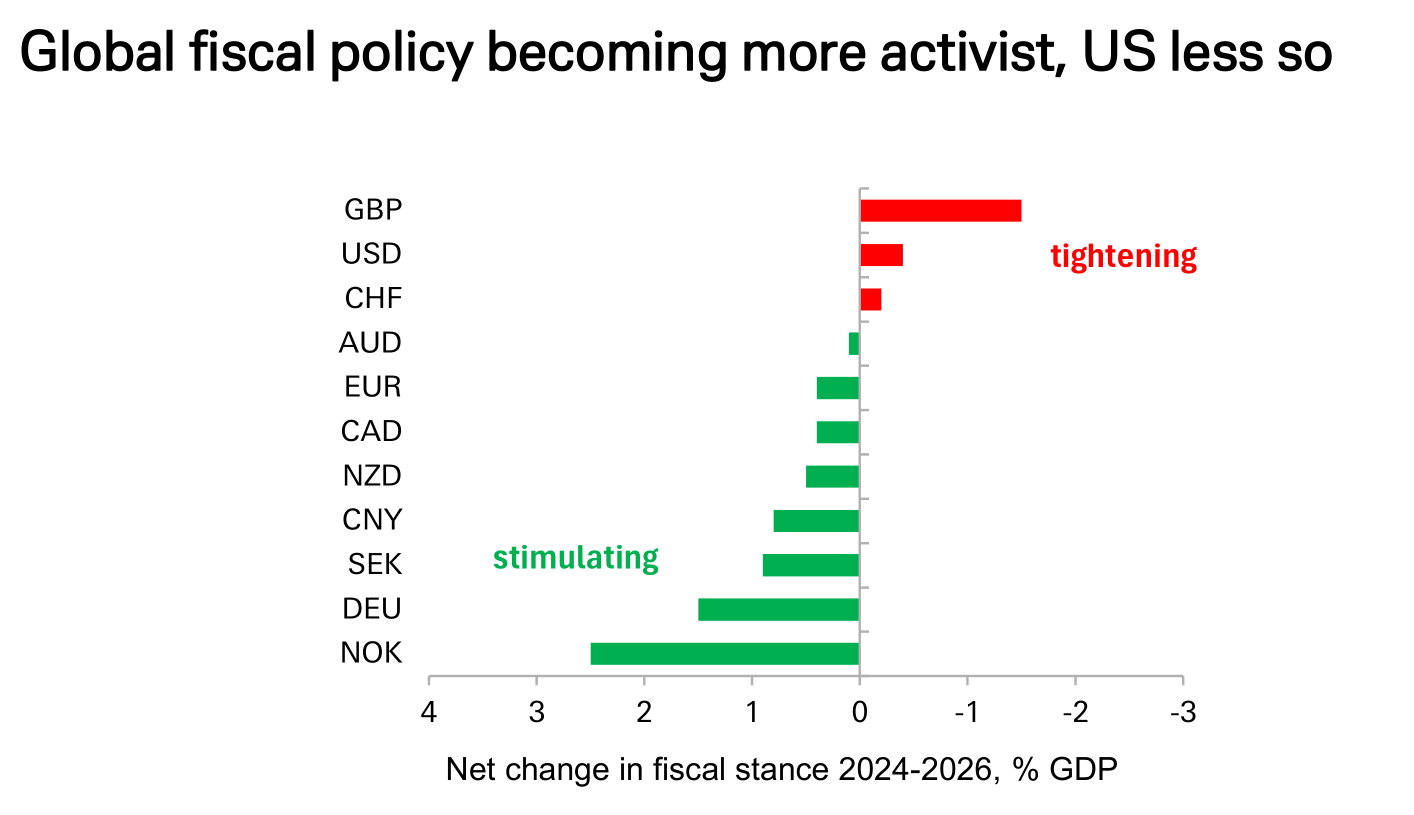 此外,从财政政策角度看,全球趋势也在发生变化。数据显示,在2024-2026年期间,美国的财政立场将趋于收紧,而欧元区和英国等地的财政政策则更具刺激性。这种“全球财政政策更积极,而美国相对保守”的格局,将进一步削弱美国经济的相对增长优势,从而对美元构成压力。