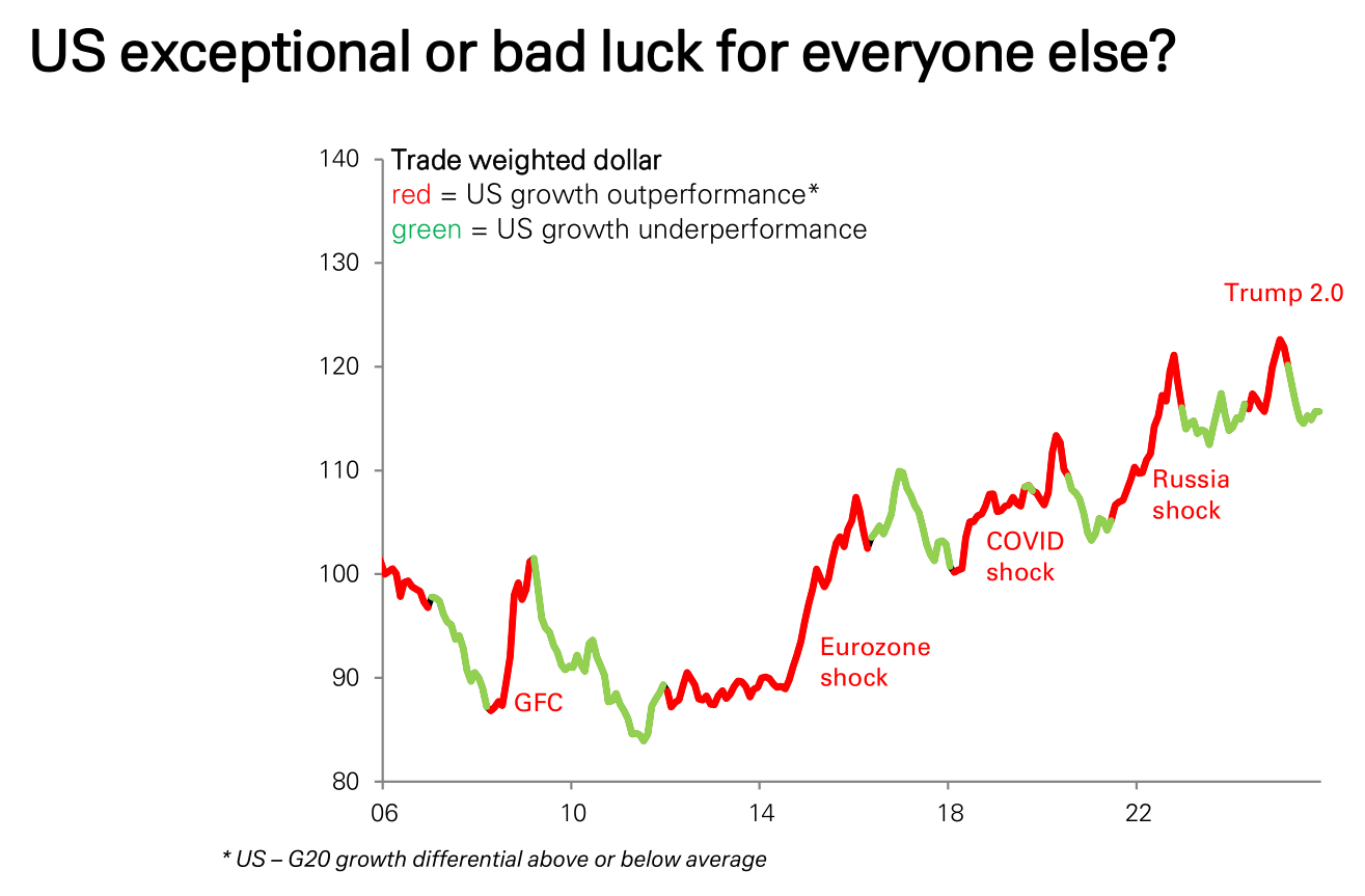 报告指出,过去近二十年里美元走强往往伴随美国相对其它G20经济体的增长更强,而这种“美国例外”很多时候并非美国本身速度特别快,而是全球不断出现对其他地区更具杀伤力的冲击(如欧债危机、疫情、俄乌冲突)。因此,每当世界出事、他国受挫,美国就显得相对更强,美元随之走高。简而言之,美元强势更多来自“别人更糟”,而不是“美国太强”。