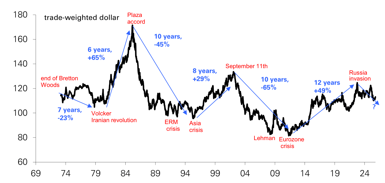 过去数年,美国经济相对于其他主要经济体的卓越增长表现,即所谓的“美国例外论”,是吸引资本流入并推高美元的另一强大动力。然而,这一趋势也正在逆转。