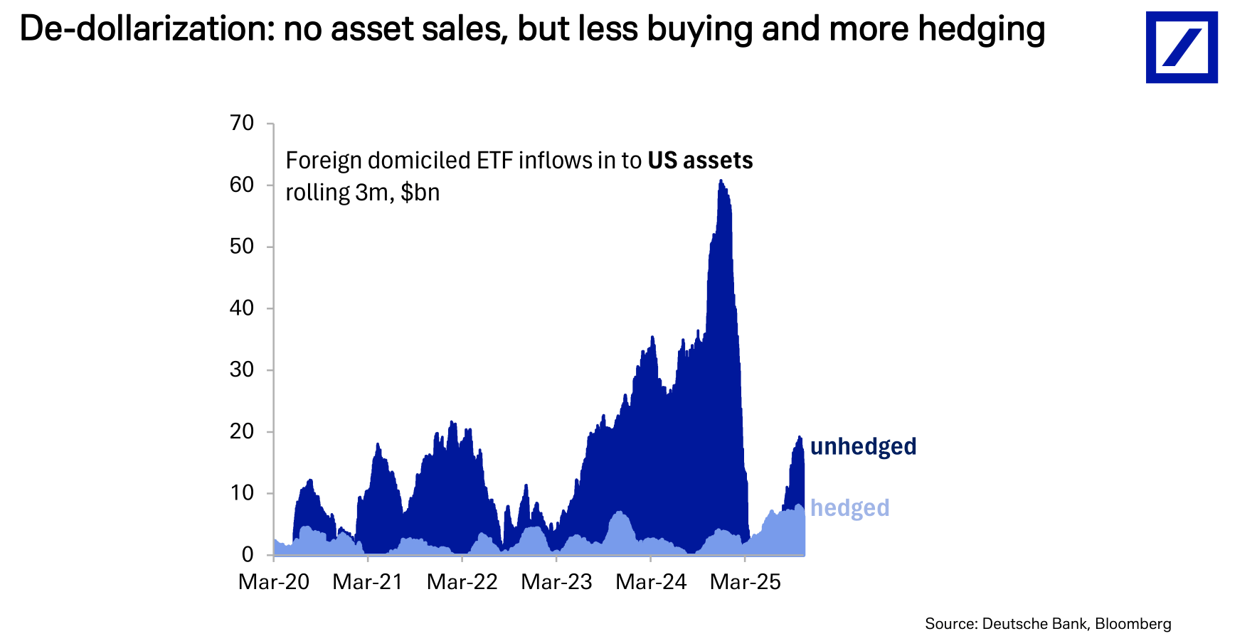 流入美国资产的外国ETF资金中,“未对冲”(unhedged)的资金流入量持续下降,而“已对冲”(hedged)的资金流入量则稳步上升。这意味着,尽管海外投资者仍在买入美国资产,但他们越来越倾向于对冲掉美元贬值的风险。这种“去美元化”的对冲行为,本身就构成了对美元的下行压力,反映出市场对美元未来走势的悲观预期。