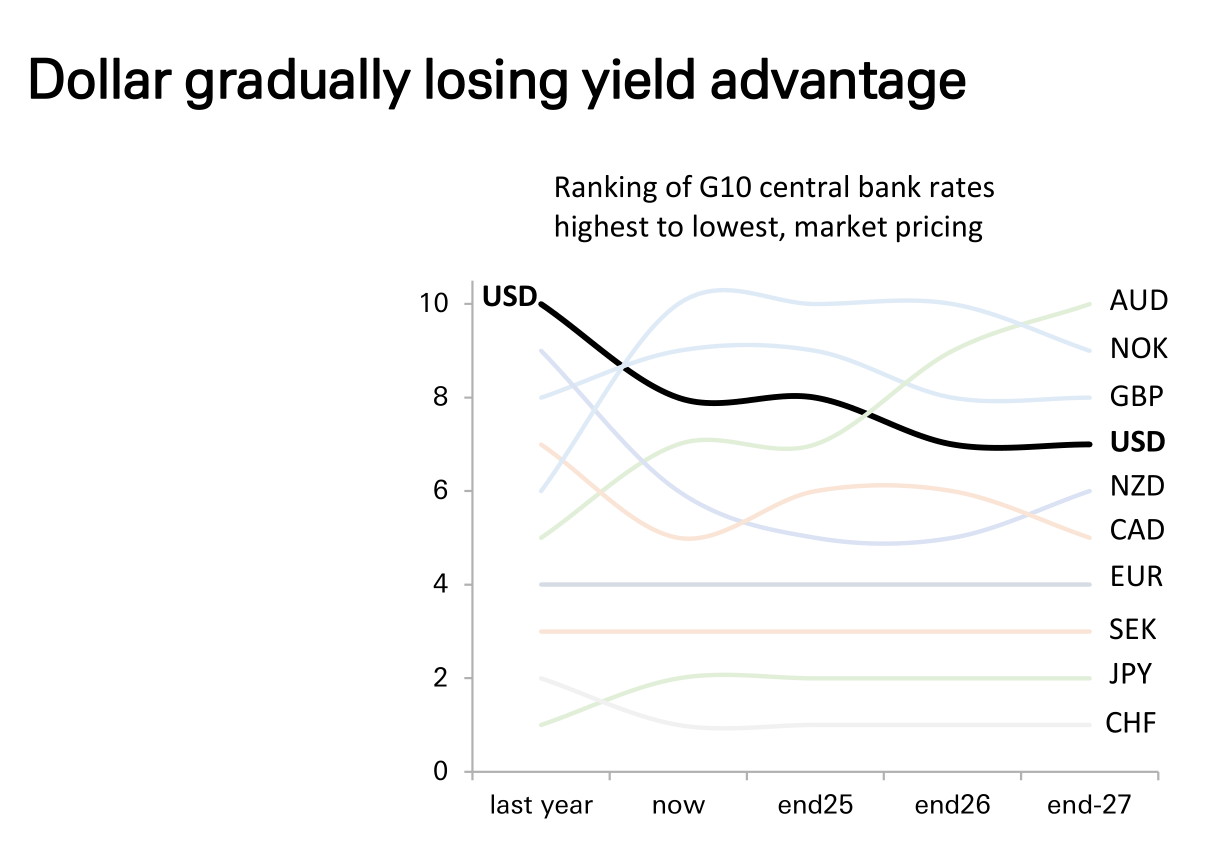 然而,这一核心支柱正在瓦解。根据市场定价对G10央行利率的预测,美元的收益率排名正面临显著下滑。报告图表显示,美元利率在G10货币中的排名,预计将从“去年”和“现在”的最高位,逐步下滑至2026年底及2027年底的中游位置。与此同时,英镑、澳元、挪威克朗等货币的收益率排名预计将超越美元。
