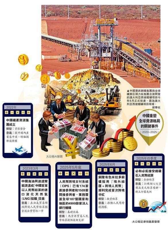 “美元信用”流失背景下,全球“去美元化”开始加速,美元在资源品贸易结算领域的垄断地位出现松动。内地媒体载文,在经多轮与中国矿产资源集团的谈判后,必和必拓同意中方提出的“铁矿石贸易人民币结算”要求,涉及其对华现货贸易的30%。
