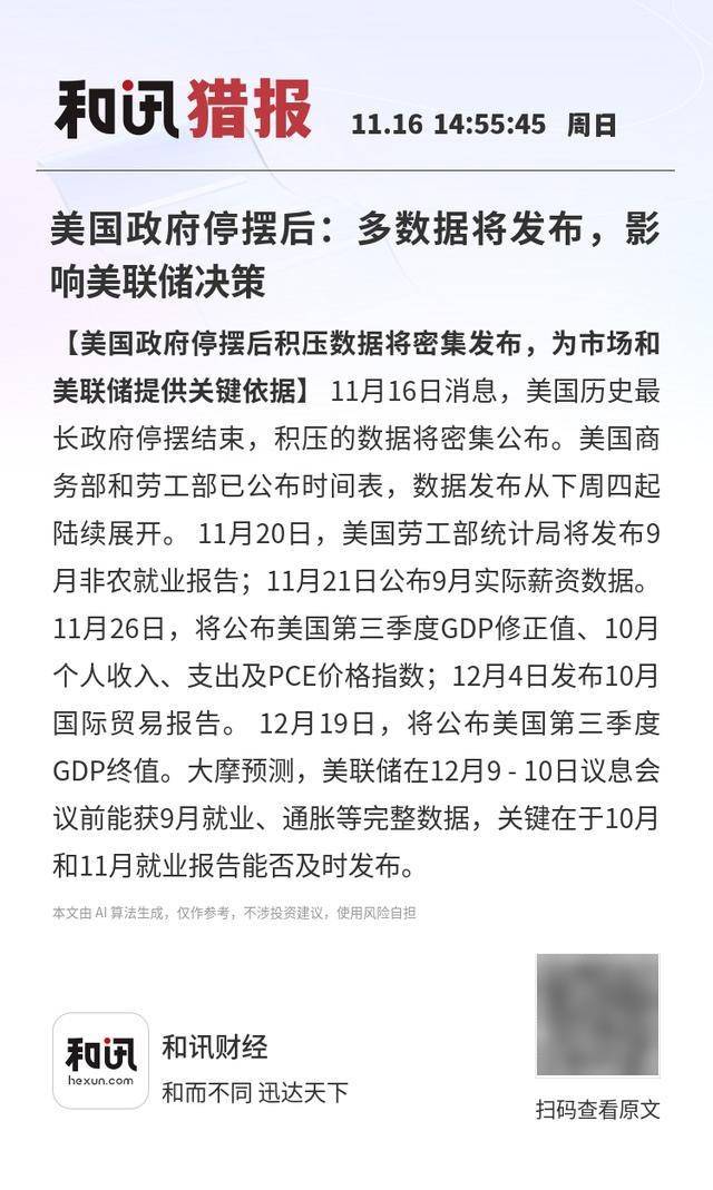 【美国政府停摆后积压数据将密集发布,为市场和美联储提供关键依据】11月16日消息,美国历史最长政府停摆结束,积压的数据将密集公布。美国商务部和劳工部已公布时间表,数据发布从下周四起陆续展开。11月20日,美国劳工部统计局将发布9月非农就业报告;11月21日公布9月实际薪资数据。11月26日,将公布美国第三季度GDP修正值、10月个人收入、支出及PCE价格指数;12月4日发布10月国际贸易报告。12月19日,将公布美国第三季度GDP终值。大摩预测,美联储在12月9 - 10日议息会议前能获9月就业、通胀等完整数据,关键在于10月和11月就业报告能否及时发布。