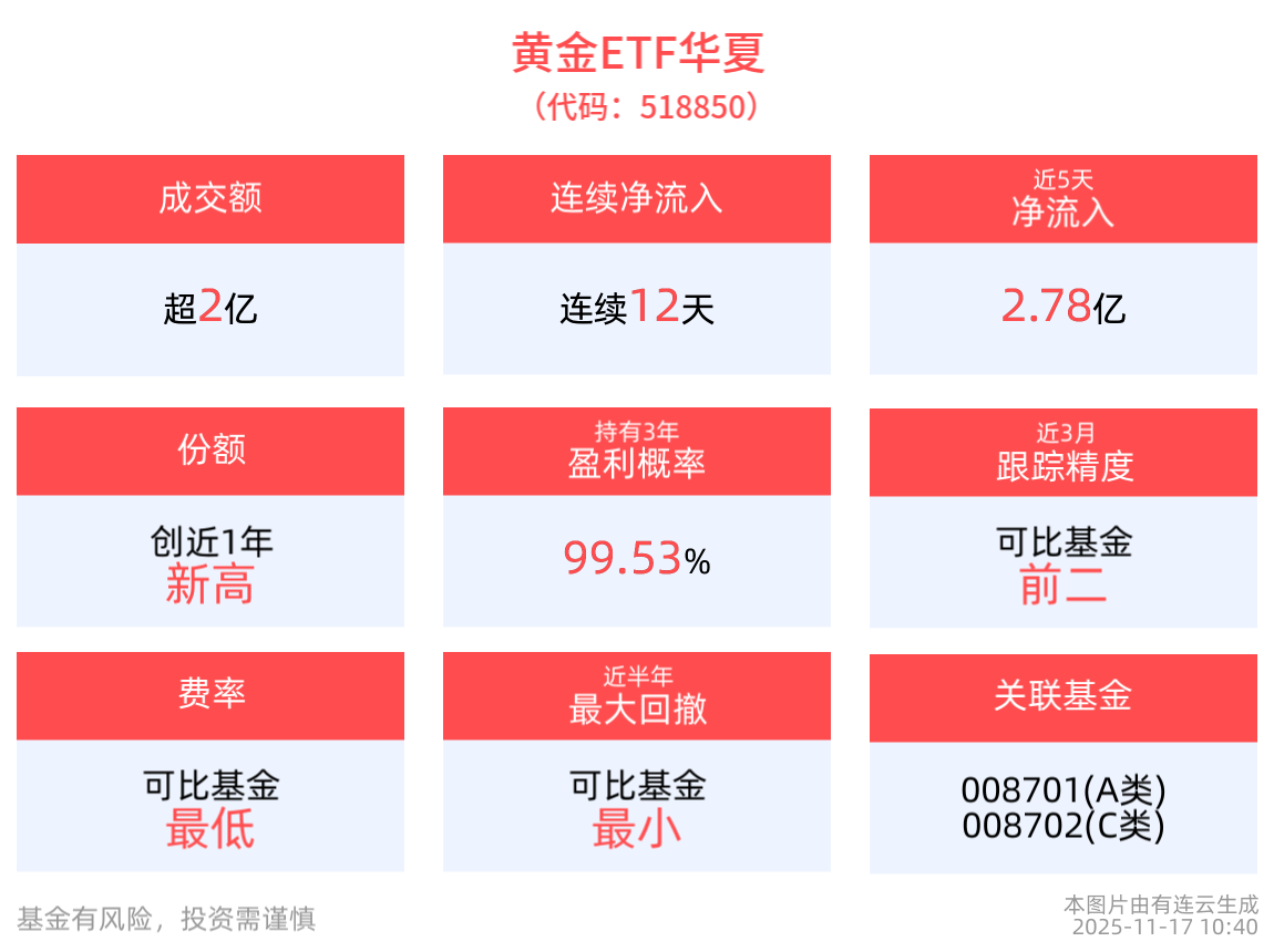 统计显示,黄金ETF华夏(518850)12天获得连续资金净流入,合计“吸金”5.95亿元。截至11月14日,黄金ETF华夏最新份额达9.86亿份,创成立以来新高。