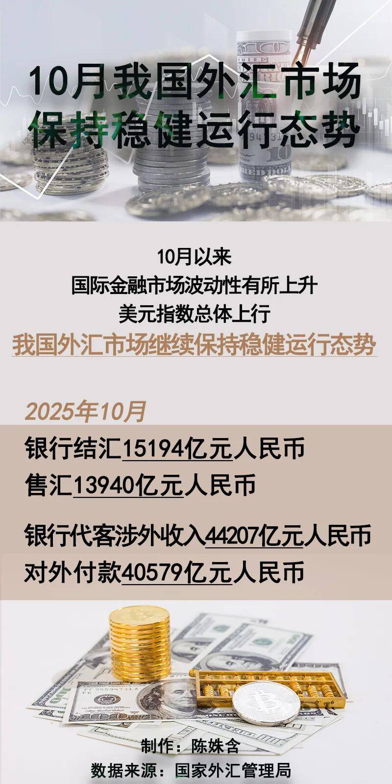 2025年10月,银行结汇15194亿元人民币,售汇13940亿元人民币。2025年10月,银行代客涉外收入44207亿元人民币,对外付款40579亿元人民币。