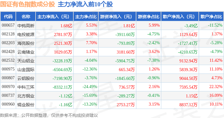 资金流向方面,国证有色(399395)指数成份股当日主力资金净流出合计43.18亿元,游资资金净流入合计13.19亿元,散户资金净流入合计29.98亿元。成份股资金流向详情见下表: