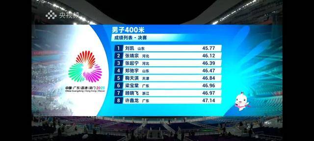 今天,全运会男子400米决赛,该项目全国纪录保持者,山东队的刘凯45秒77夺得金牌,河北队的张靖宗46秒12获得银牌,河北队的张起宁46秒39获得铜牌,山东队另一位选手郑驰宇46秒47获得第四,广东队的梁宝棠46秒96获得第六。
