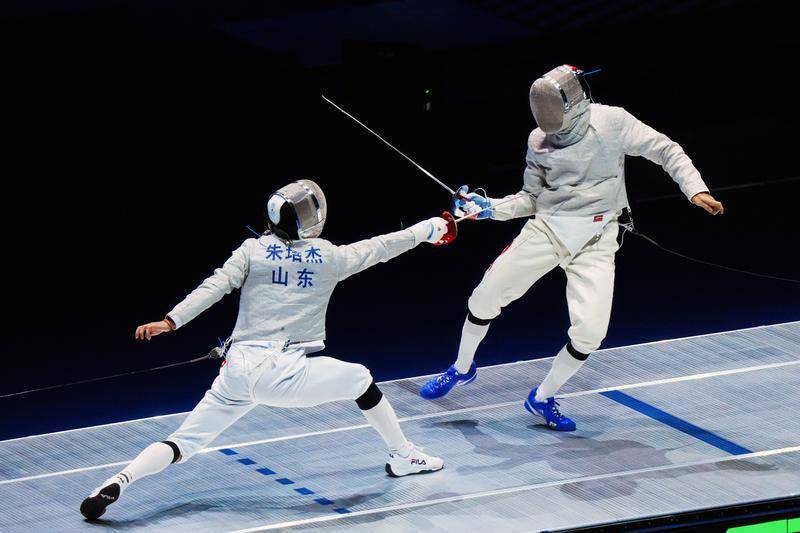 11月18日,山东队选手朱培杰(左)和广东队选手邓小浩在比赛中。