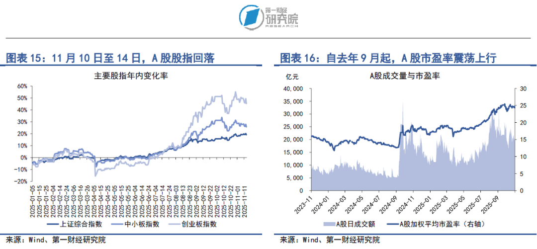 上周,A股成交量上升、市盈率保持稳定。在11月10日至11月14日的当周,A股日均成交量约为2.05万亿元,较前一周上升1.6%;市盈率为24.5,与前一周保持稳定。从A股的杠杆情况来看,截至11月14日,A股融资融券余额达到2.47万亿元,融资余额占总市值的比重为2.31%。