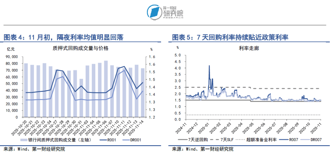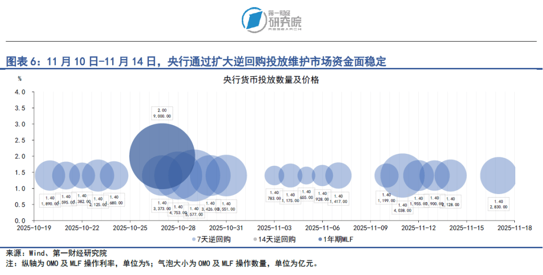 银行与非银之间的流动性差异始终处于低位,表明整个银行间市场的流动性稳定充裕。在11月10日至11月14日当周,R007与DR007之间的平均差值大约为1.41BP。通常而言,当R007与DR007差值在10BP以下时,我们认为银行与非银之间的流动性差异不显著。