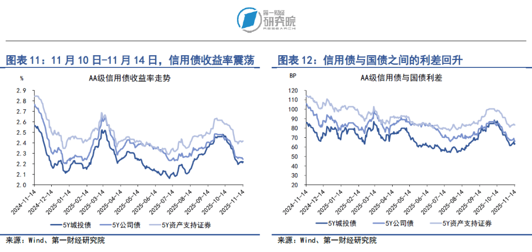 在11月10日至11月14日当周,多数品种信用债收益率涨跌不一。在AAA级债券中,5年期公司债和资产支持证券收益率分别上升2.2BP和0.66BP。在AA级债券中,5年期公司债和资产支持证券收益率分别上升0.9BP和0.93BP。