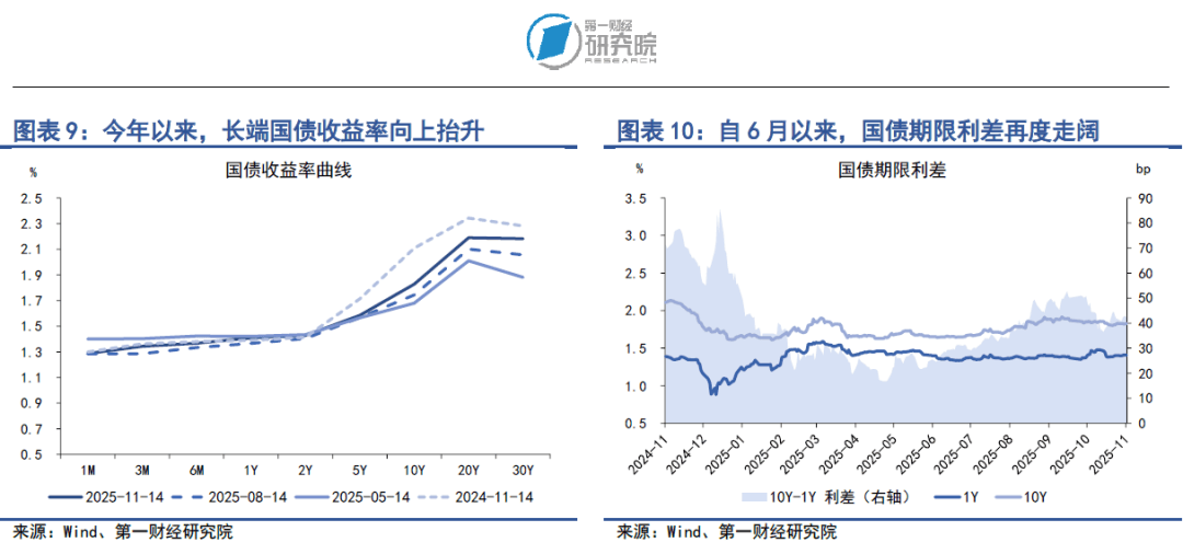 从国债利差来看,在11月10日至11月14日的当周,国债期限利差较前一周小幅上升,10年期与1年期国债之间的利差上升0.2BP至41.95BP。从年内来看,国债期限利差在1-5月持续收窄,而自6月以来,国债期限利差再度呈现走阔的趋势,与2024年底相比,降幅为18BP。