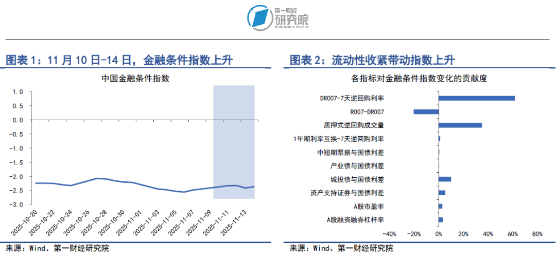 在2025年11月10日至11月14日当周,第一财经研究院中国金融条件日度指数均值为-2.36,较前一周上升0.14。从指数的分项指标来看,上周流动性边际收紧带动指数上升。从货币指标来看,主要货币利率上行,质押式回购成交量下降。从债券指标来看,信用债收益率和信用利差同步上升。从股市指标来看,市盈率和杠杆水平保持稳定。