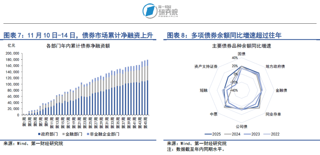 从债券余额增速来看,今年多项债券余额同比增速超过往年同期。截至11月14日,政府部门债券余额同比增速为19.4%,较2024年同期上升4.4个百分点;金融部门债券余额同比增速为11.7%,较2024年同期上升0.4个百分点;非金融企业部门债券余额同比增速为7%,较2024年同期增速上升3.3个百分点。