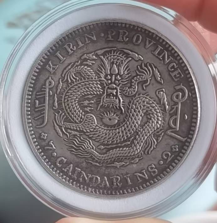 - **外文与装饰**:龙纹外圈环绕英文“KIRIN PROVINCE”(吉林省)与“7.2 CANDAREENS”(七钱二分),体现了近代中国货币与国际计量体系的接轨,是清末中国融入世界经济体系的微观缩影。龙纹两侧还带有满文符号,这是清代货币的传统元素,保留了民族文化的印记。