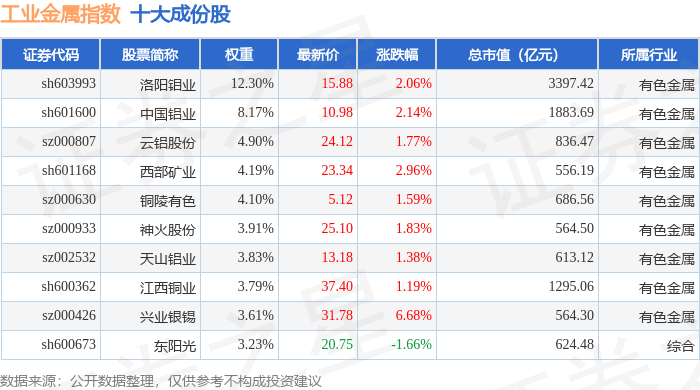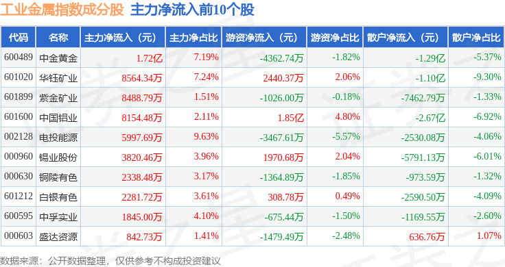 资金流向方面,工业金属(980043)指数成份股当日主力资金净流出合计4.61亿元,游资资金净流入合计2.34亿元,散户资金净流入合计2.27亿元。成份股资金流向详情见下表: