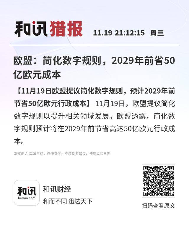 【11月19日欧盟提议简化数字规则,预计2029年前节省50亿欧元行政成本】11月19日,欧盟提议简化数字规则以提升相关领域发展。欧盟透露,简化数字规则预计将在2029年前节省高达50亿欧元行政成本。