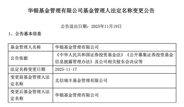 11月19日,原北信瑞丰基金发布更名公告。自11月17日起,该公司从“北信瑞丰基金管理有限公司”正式更名为“华银基金管理有限公司”。此次公司名称变更已完成工商变更登记手续,后续还会对旗下公募基金产品名称做相应调整。