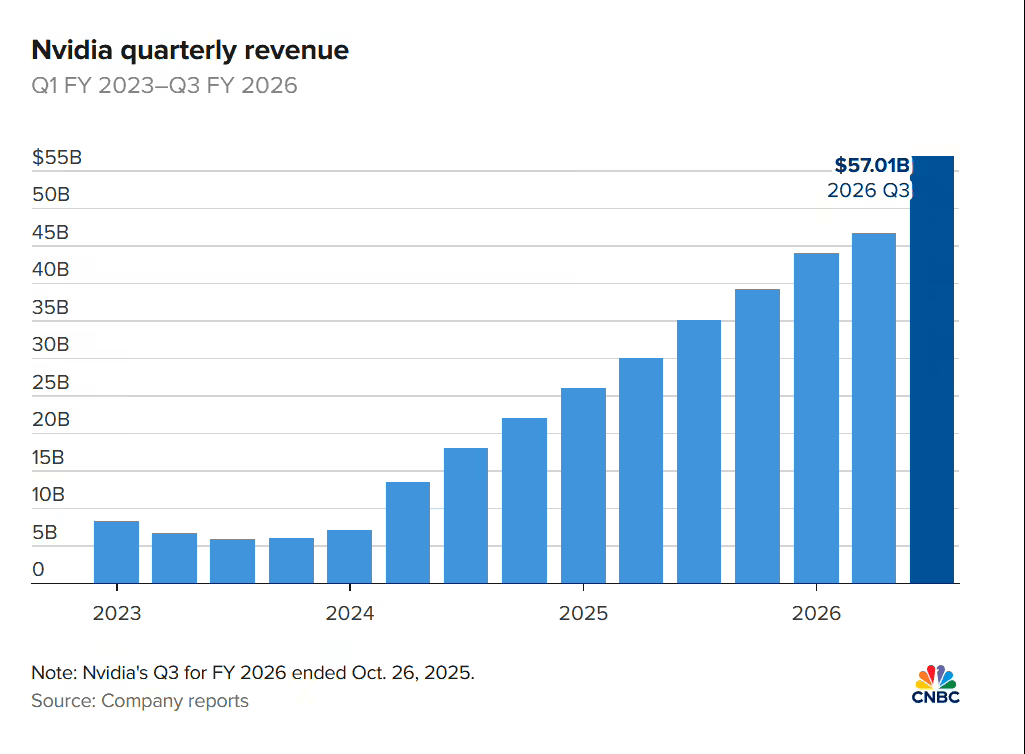 DoNews11月20日消息,英伟达11 月 20 日发布了 2026 财年第 3 财季(截至 10 月 26 日)财报,各项数据均创下历史新高。财报显示,公司该季度实现创纪录营收 570 亿美元,较去年同期的 350.8 亿美元大幅增长 62%,相比上一季度的 467.4 亿美元也增长了 22%。