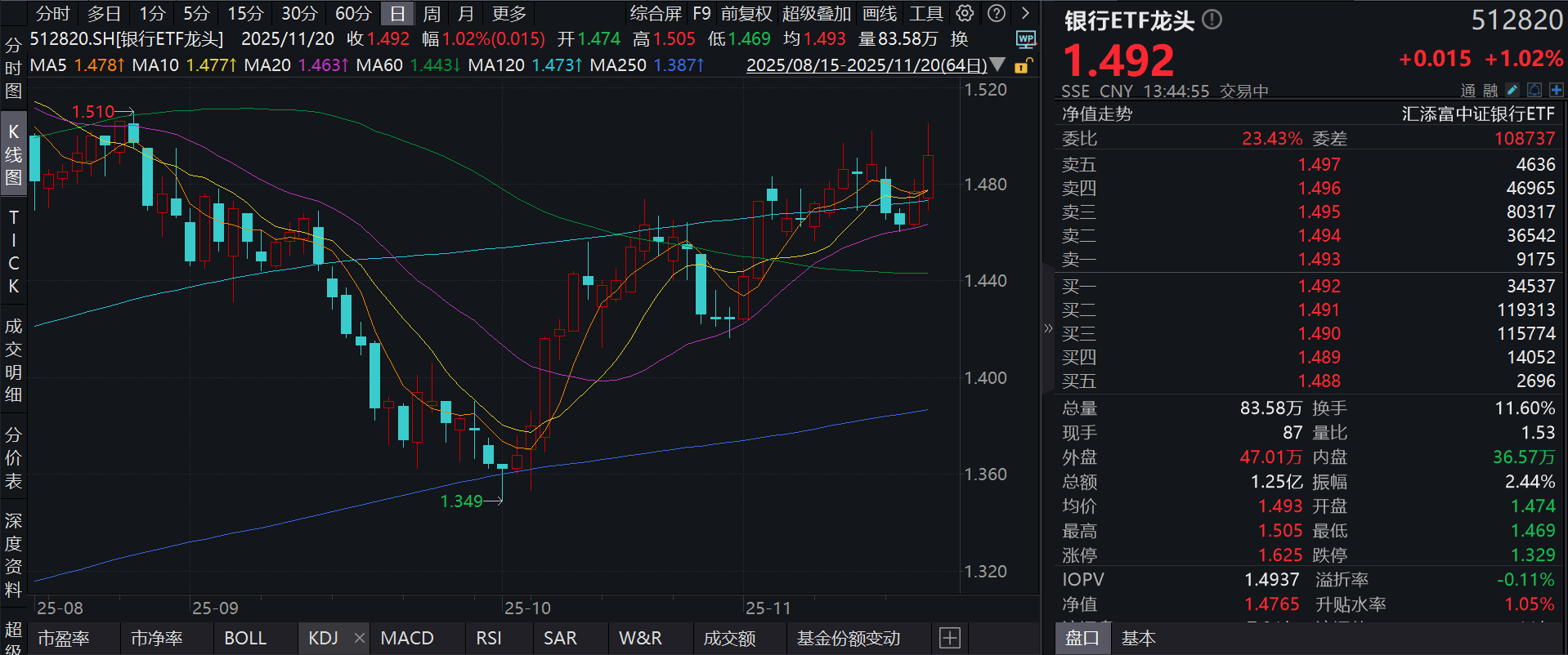 截至2025年11月20日 13:44,中证银行指数(399986)强势上涨1.07%,成分股中国银行(601988)上涨4.33%,建设银行(601939)上涨3.36%,邮储银行(601658)上涨3.14%,民生银行(600016),光大银行(601818)等个股跟涨。银行ETF龙头(512820)一度涨近2%,现涨1.02%,最新价报1.49元。拉长时间看,截至2025年11月19日,银行ETF龙头近1月累计上涨2.71%。