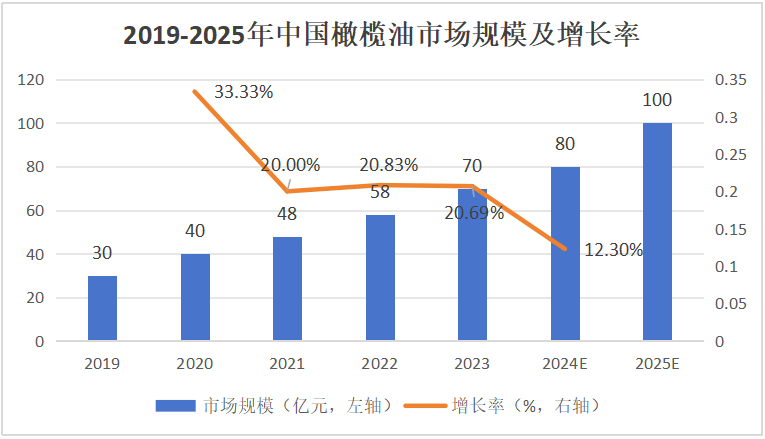 大河财立方记者梳理发现,尽管规模持续增长,行业体量却整体有限。中研普华产业研究院发布的《2025—2030年中国橄榄油市场规划研究及未来潜力预测咨询报告》显示,2024年我国橄榄油市场规模突破80亿元,2019—2024年复合增长率达12.3%;预计到2025年,市场规模将接近100亿元。不过,这一数额相较于传统食用油品类,仍显小众。