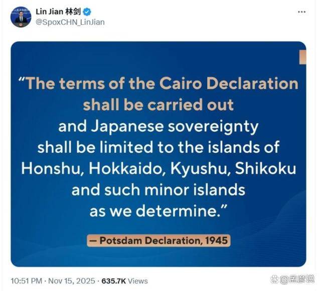 日前,外交部发言人林剑在海外社交媒体上,发布英文《波茨坦公告》节选:《开罗宣言》之条件必将实施,而日本的主权必将限于本州、北海道、九州、四国及吾人决定其可以领有之小岛在内。