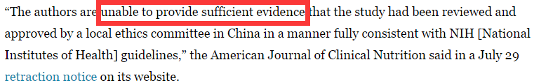 然而在他们发表的杂志《the American Journal of Clinical Nutrition》的调查时候发现,论文的作者无法提供符合NIH伦理审查的证据。