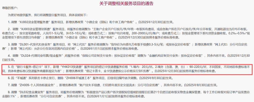 9月28日,招商银行发布了一则“关于调整相关服务项目的通告”,宣布对个人借记卡用户新增“快递费”收费项目,标准是境内收费 20 元 / 封,境外(含港澳台)90 - 220 元 / 封。虽然对普卡、金卡打五折,但过去招商银行通常免费邮寄新办或补换的借记卡(尤其是金卡及以上客户),普通卡也可能免邮。