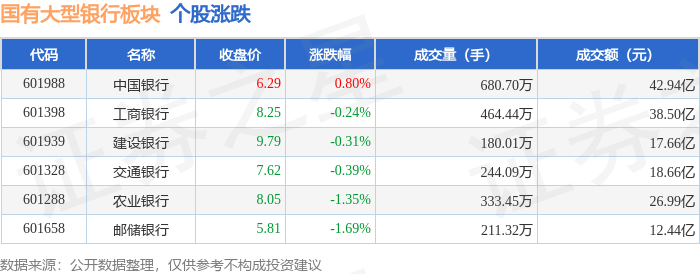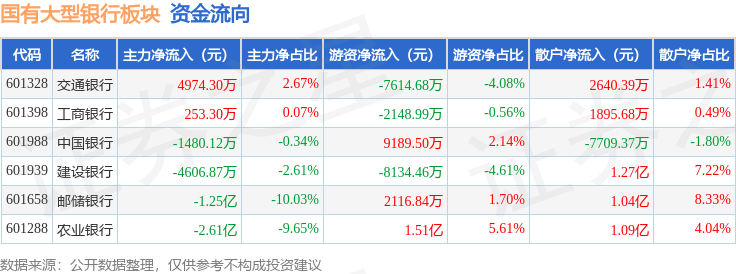 从资金流向上来看,当日国有大型银行板块主力资金净流出3.94亿元,游资资金净流入8543.62万元,散户资金净流入3.08亿元。国有大型银行板块个股资金流向见下表: