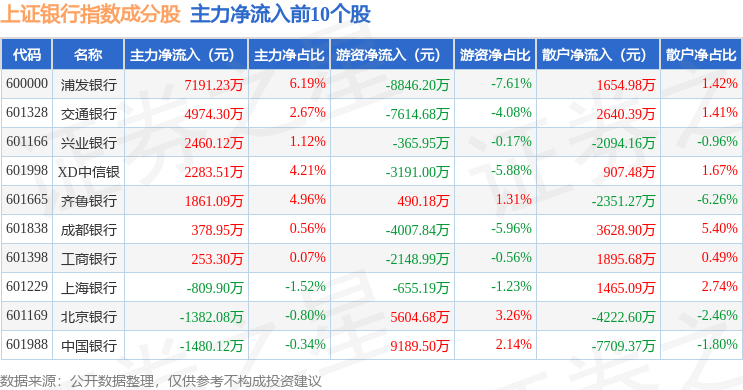 资金流向方面,上证银行(000134)指数成份股当日主力资金净流出合计11.22亿元,游资资金净流入合计4.01亿元,散户资金净流入合计7.21亿元。成份股资金流向详情见下表: